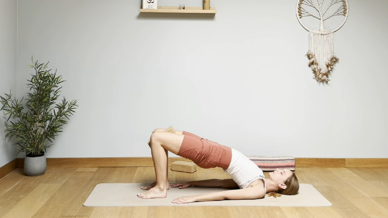 De shoulder bridge of brug houding opent de borst en longen, versterkt het onderlichaam en core en versoepelt de rug. Bovendien werkt de pose kalmerend voor mind door meer bloedcirculatie en zuurstoftoevoer naar de hersenen te voorzien. Een ideale pose bij stress.